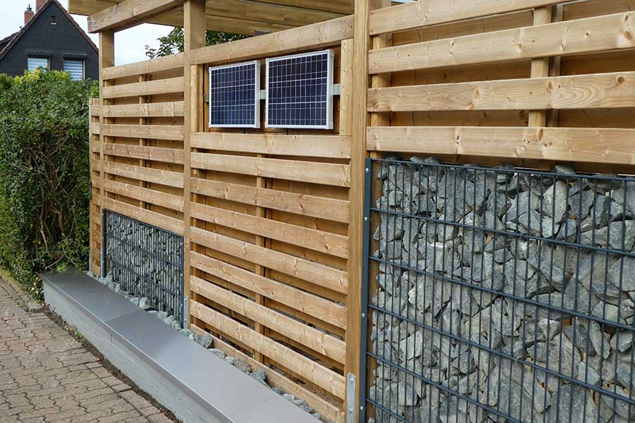 Roßbergs Sichtschutzelementsystem Roßberg VarioPlus Steine und Solarstrom. Lässt Wasser laufen und beleuchtet den Garten.
